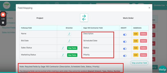 Mapping ensures that your Work Order information flows correctly between Sage 100 Contractor and Followup CRM before you begin creating, updating, or syncing records.