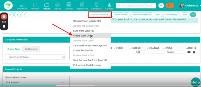 In the project, open the Sage 100 Contractor options and select Create Work Order.