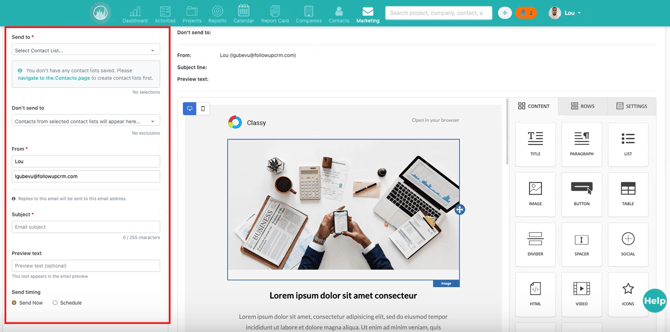 In this article, you’ll learn how to navigate the Email Marketing section in Followup CRM, create or choose a template, design your message, select recipients, and send or schedule a marketing email.