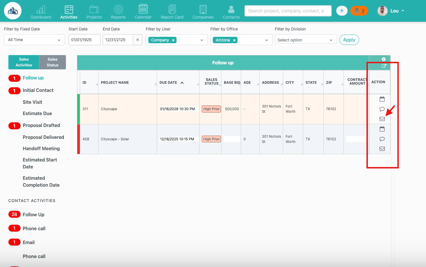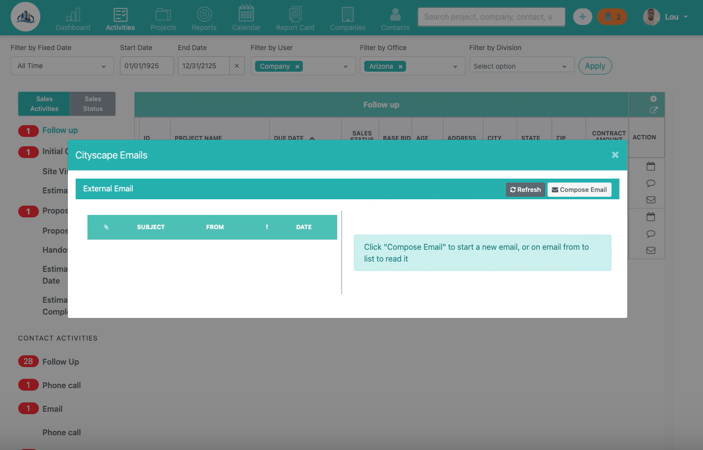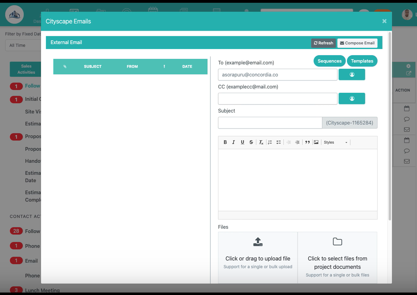 This allows you to view and send emails related to the selected contact or project directly from the Activities view.