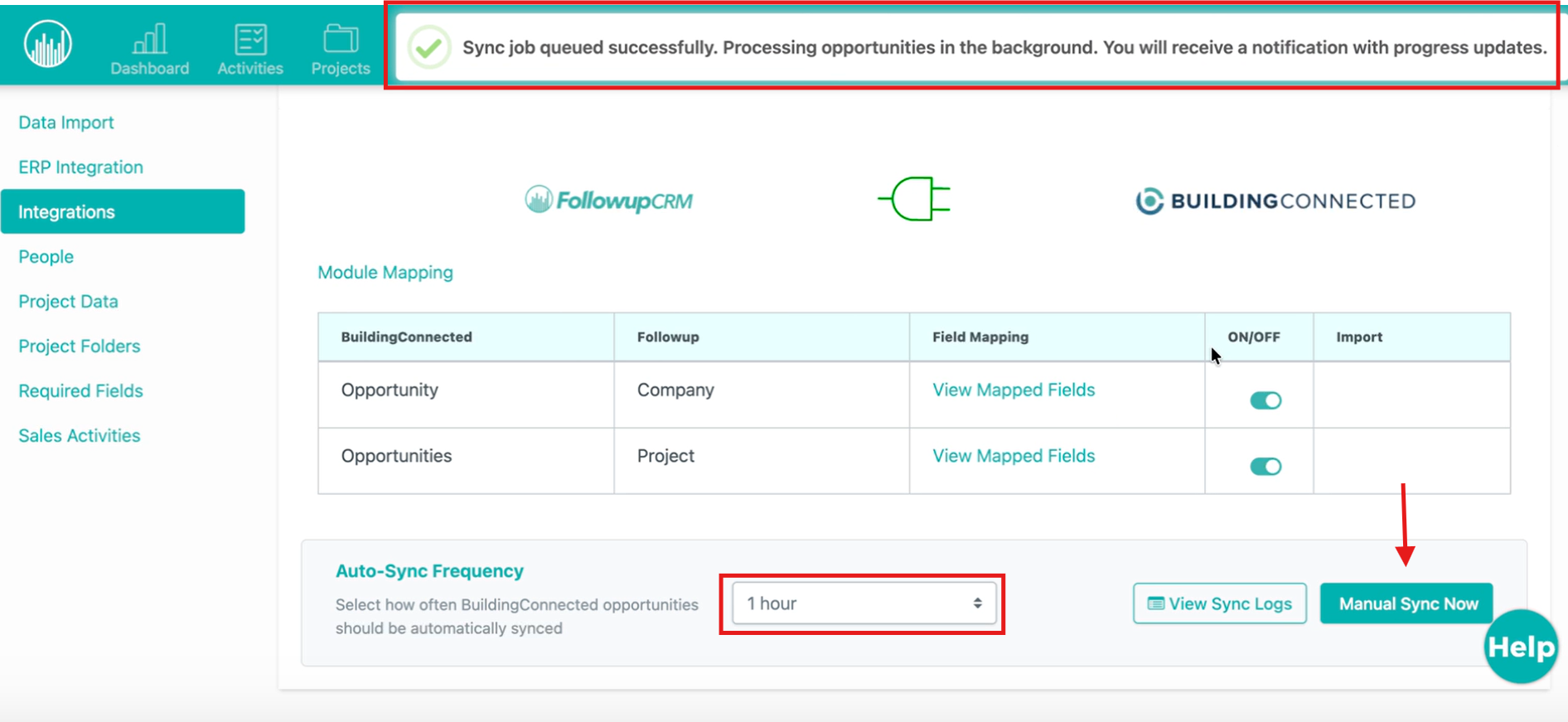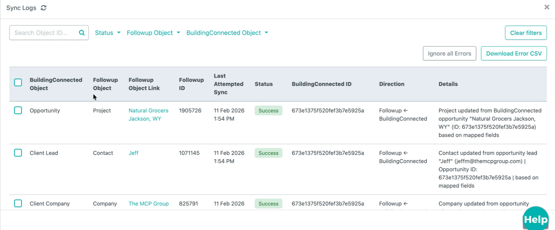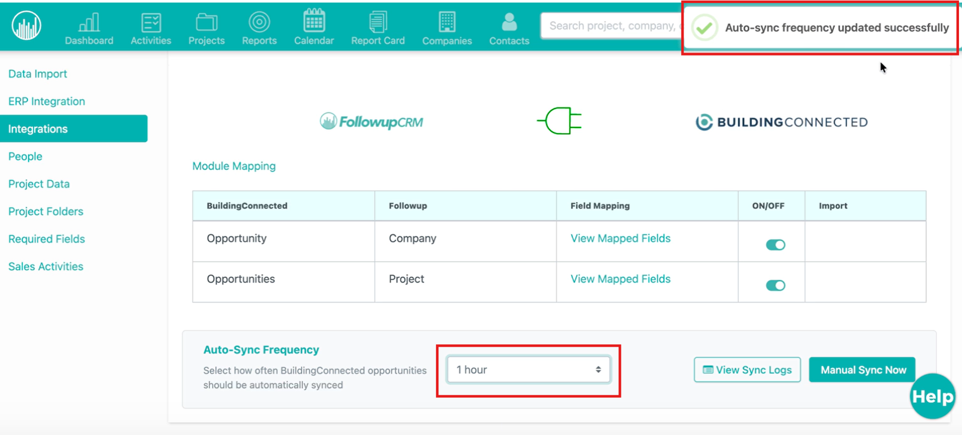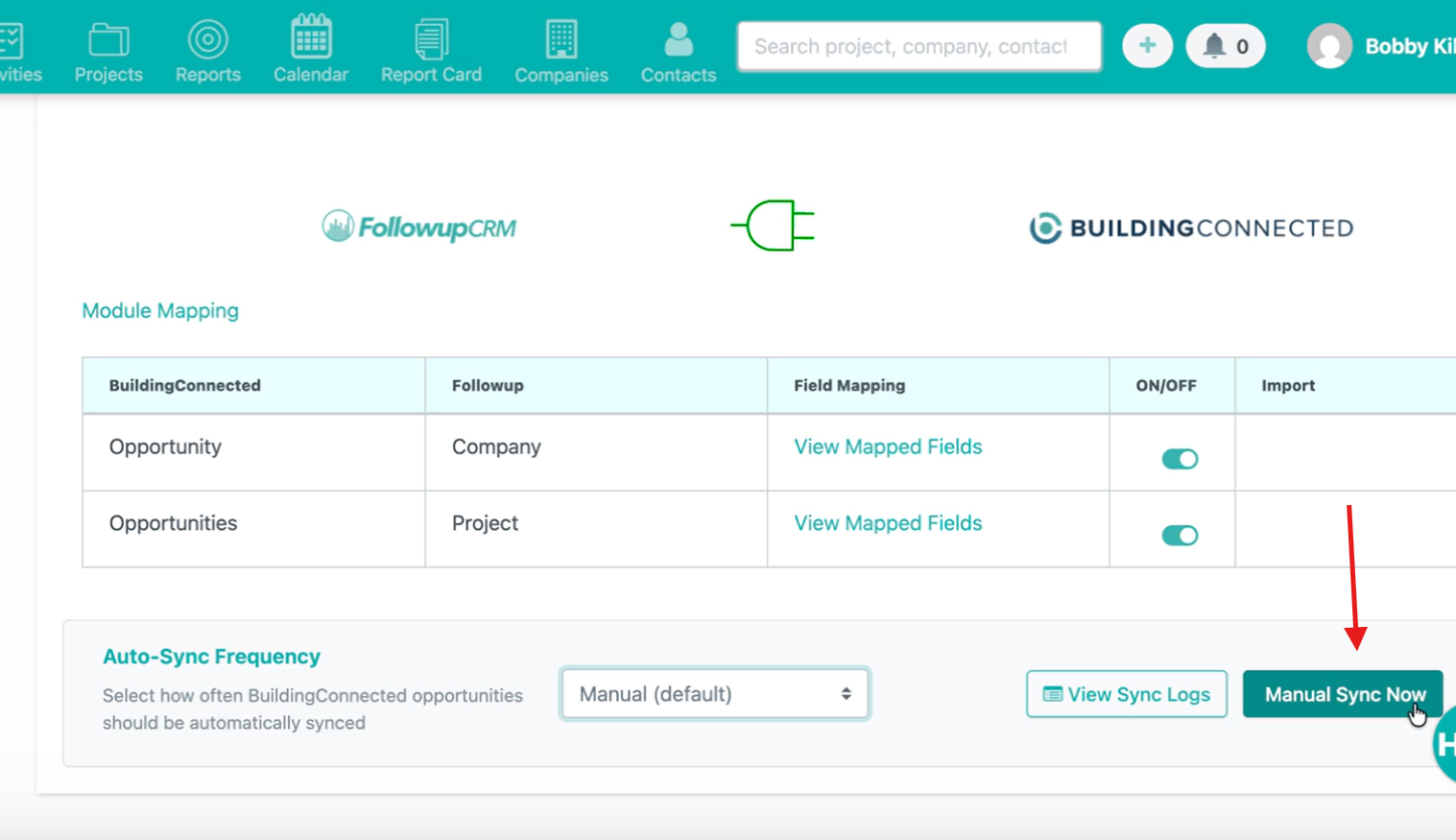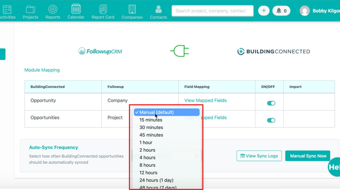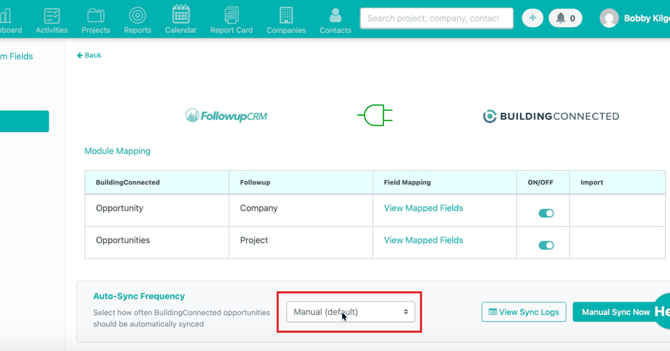In this article, you’ll learn how to choose how often Followup automatically syncs projects and bids from BuildingConnected, how to run a manual sync anytime, and where to review sync history logs.