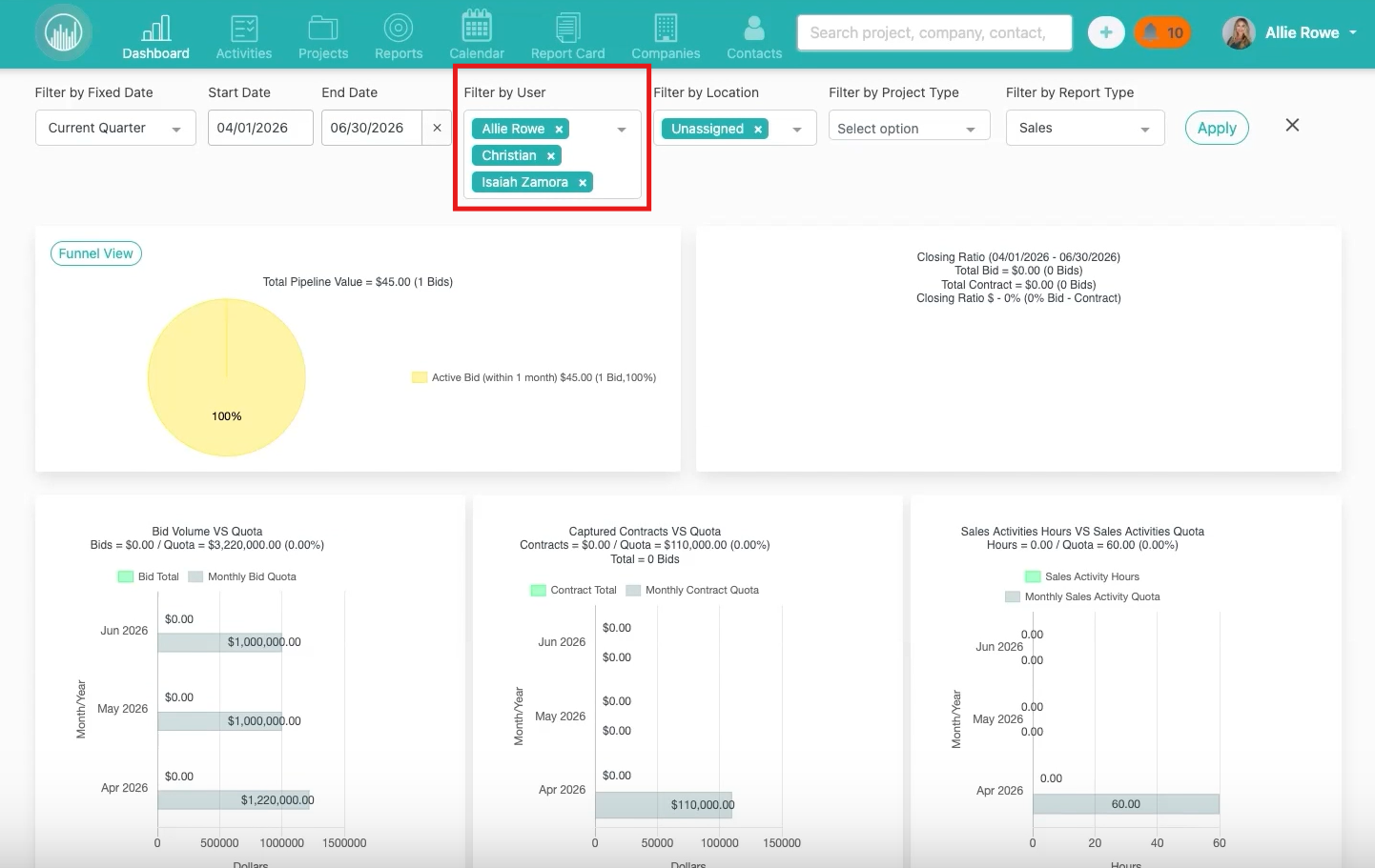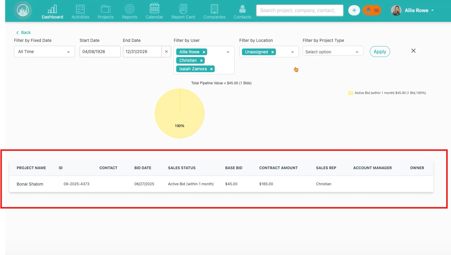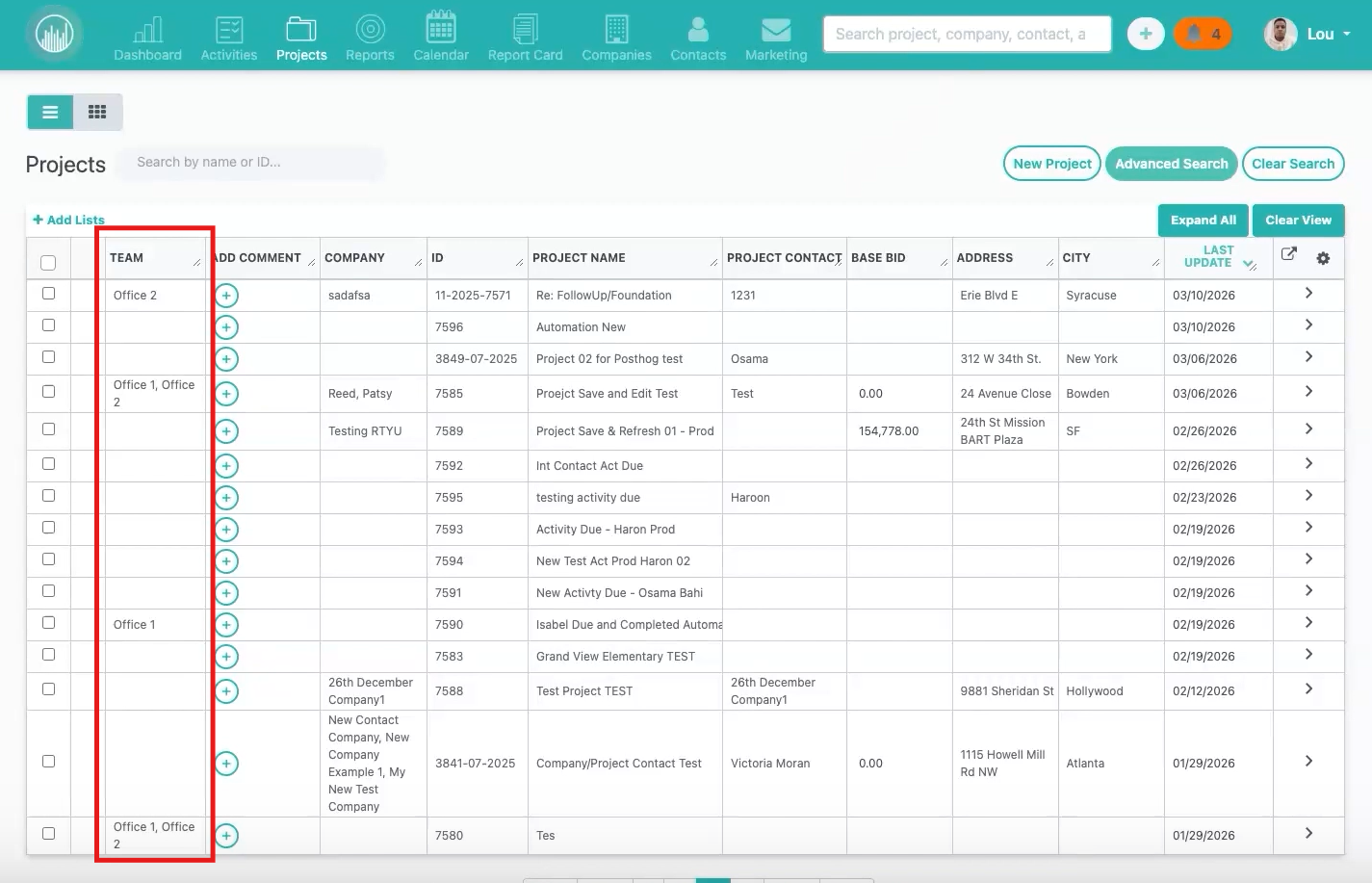 - Dashboard reports show only Team Office One projects
