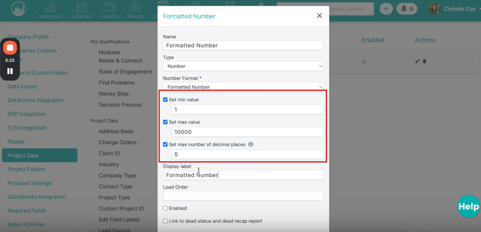 Create a formatted Number field, set min/max and decimal rules, and save values with automatic formatting.