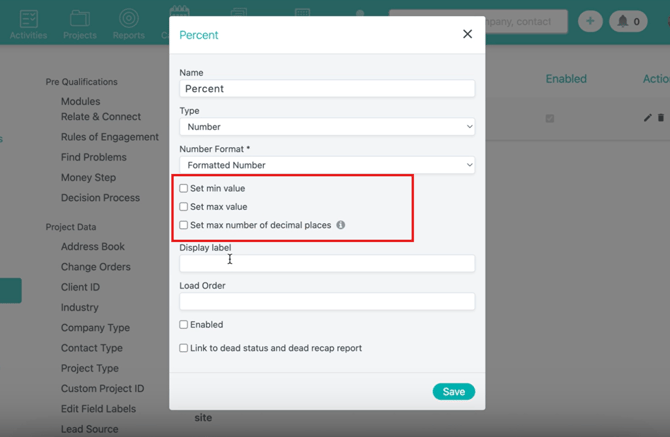 Create a Number field, choose from four number formats, and apply rules like min/max values and decimals.