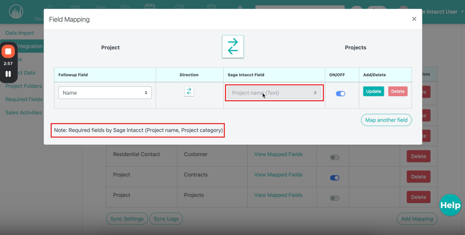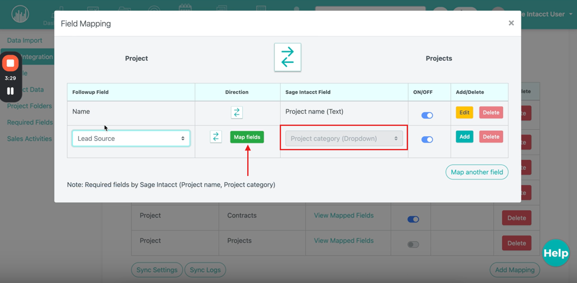 At the bottom of the Mapped Fields window, you’ll see a note listing Sage Intacct’s required fields. These must be filled for the integration to work correctly.